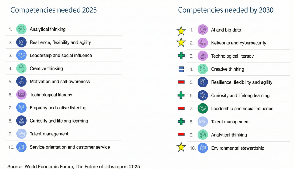 Drawing on data from the World Economic Forum and his own industry analysis, Pitkänen outlined the essential competencies for future C-suite leaders. While foundational skills like leadership and analytical thinking remain important, a new profile is emerging.